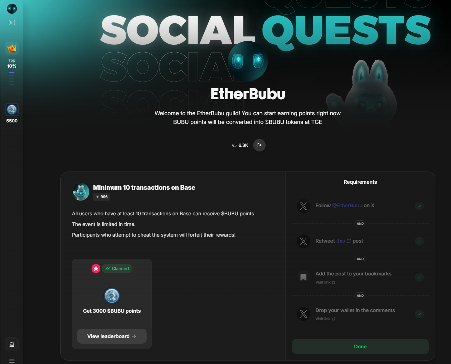 Farm EtherBubu on Base by doing 10 on-chain txs, completing Guild quests, minting FCFS badges, and stacking points that convert directly into $BUBU at TGE.